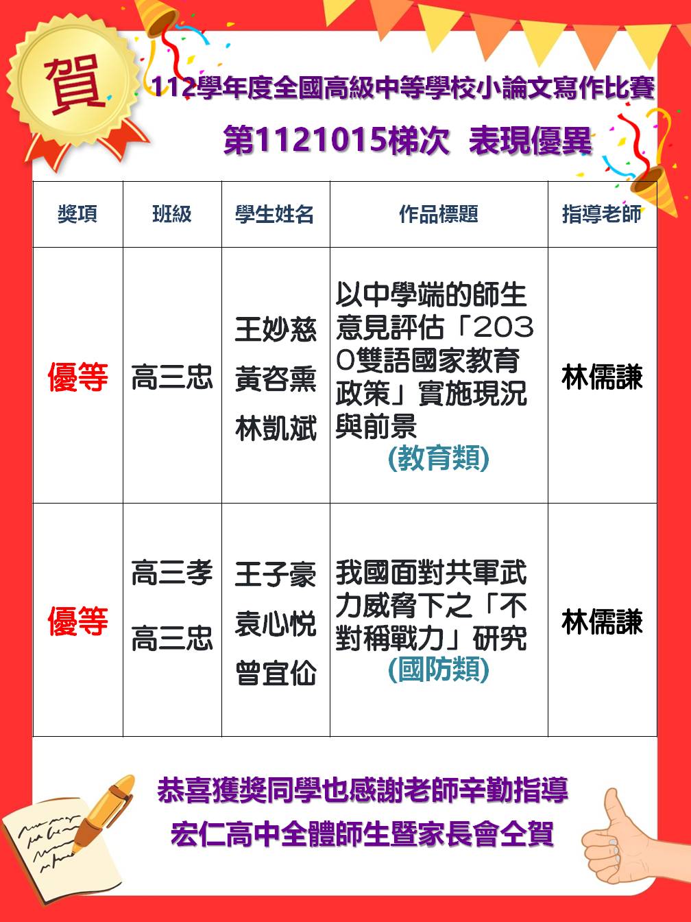 恭賀本校參加全國112學年度第1121015梯次小論文競賽 表現優異