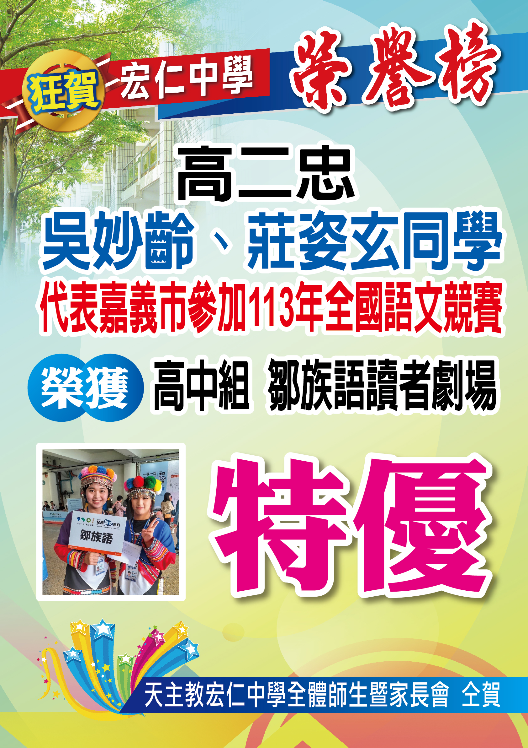 狂賀!高二忠吳妙齡、莊姿玄同學,參加113年全國語文競賽,榮獲高中組鄒族語讀者劇場 特優