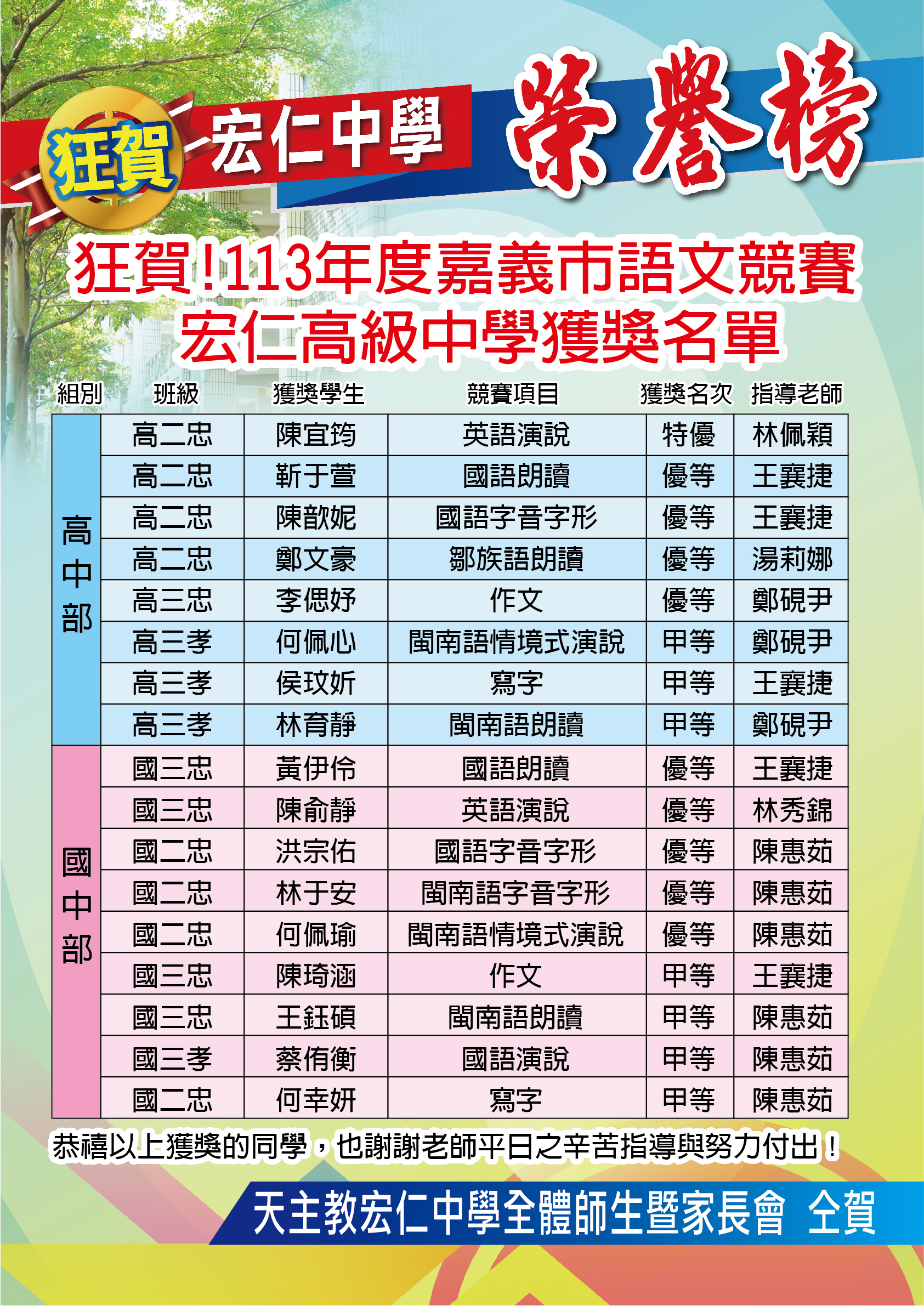 恭賀宏仁中學參加113年語文競賽,榮獲佳績!
