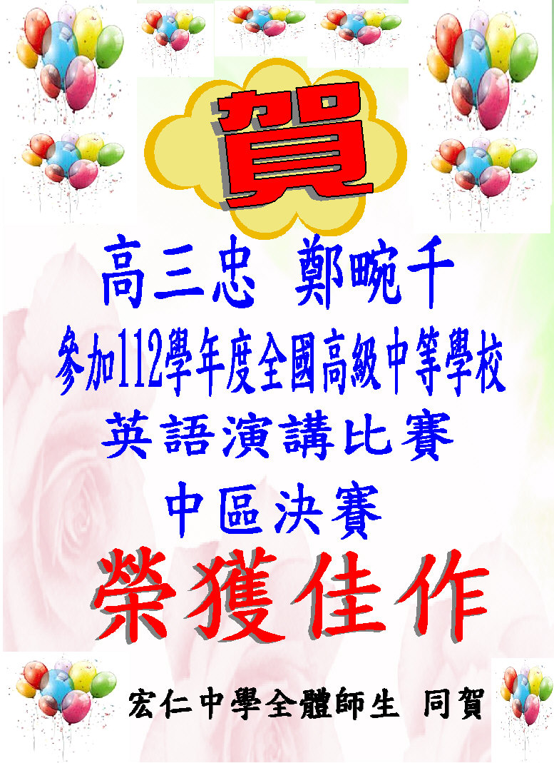 恭賀宏仁中學參加112學年度中區英文演講,榮獲佳績!