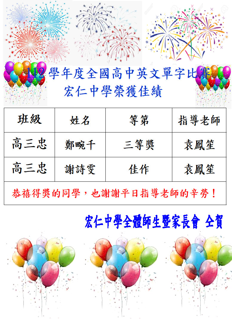 恭賀本校參加112學年度全國高中英文單字比賽,榮獲佳績