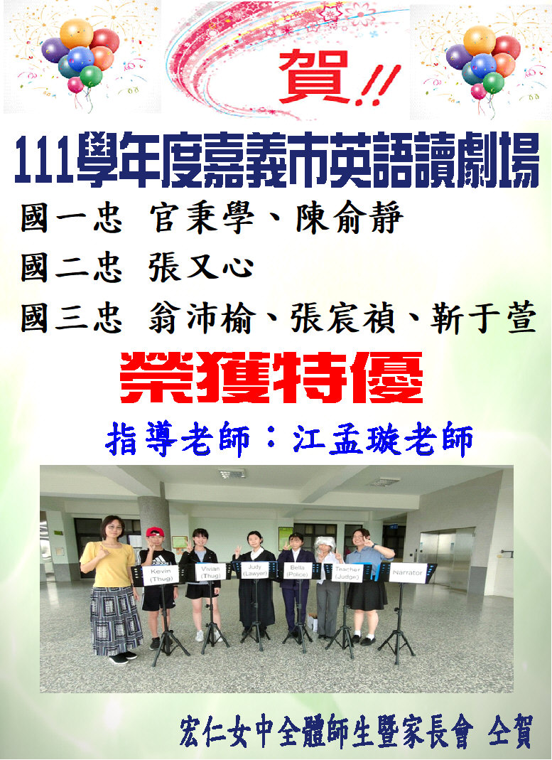 恭賀宏仁女中參加嘉義市111學年度國中小英語讀者劇場比賽,榮獲特優!
