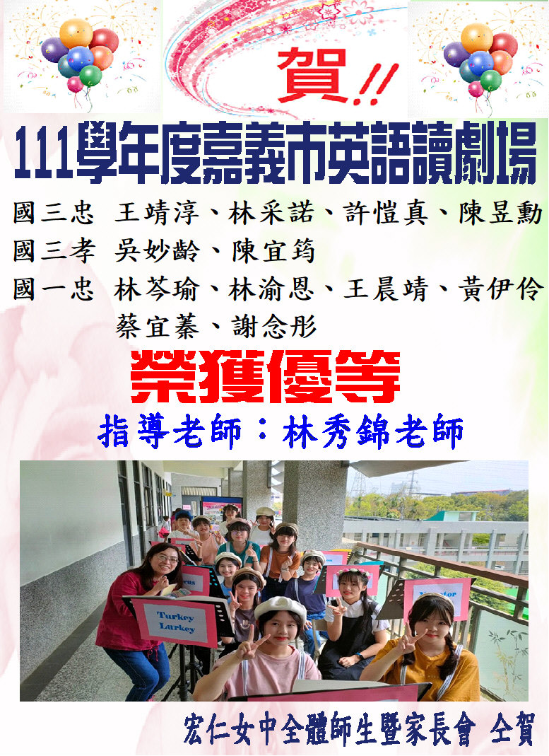 恭賀宏仁女中參加嘉義市111學年度國中小英語讀者劇場比賽,榮獲優等!