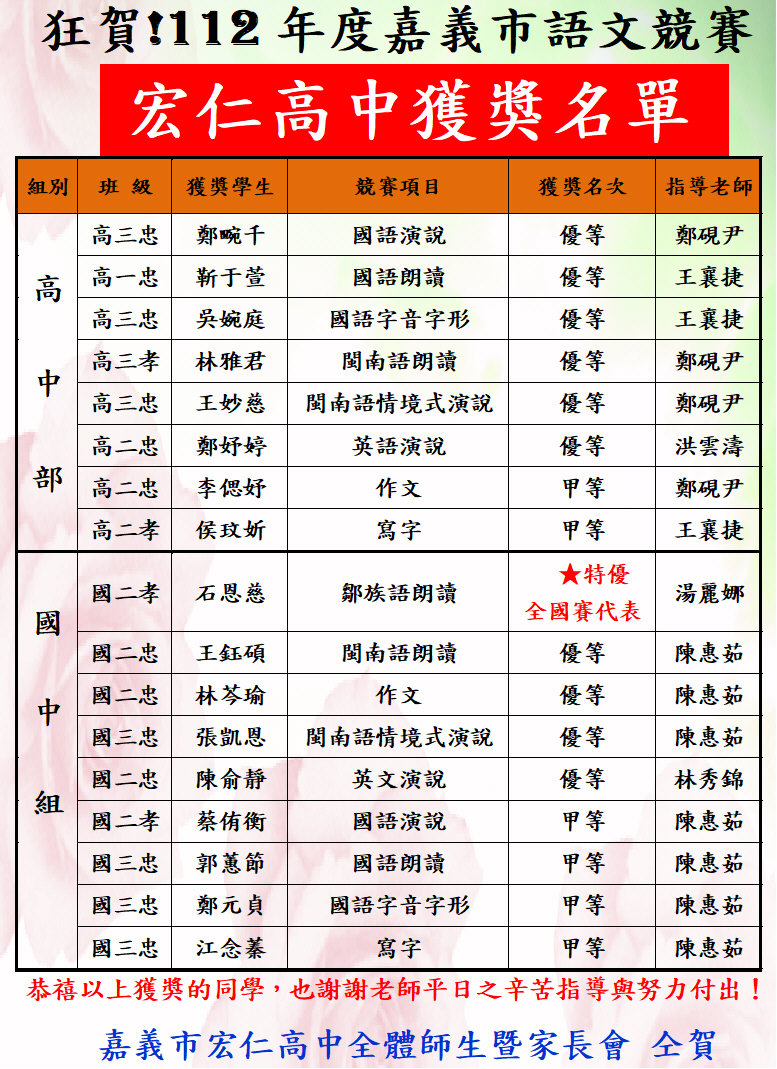 恭賀宏仁高中參加112年語文競賽,榮獲佳績!