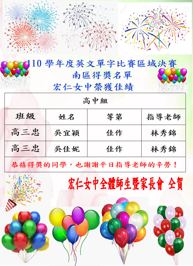 恭賀本校高三忠吳佳妮、吳宜穎同學,參加110學年度南區英文單字大賽,榮獲佳績!