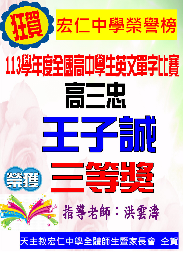 恭賀!高三忠王子誠同學,參加113學年度全國高中學生英文單字比賽,榮獲三等獎!