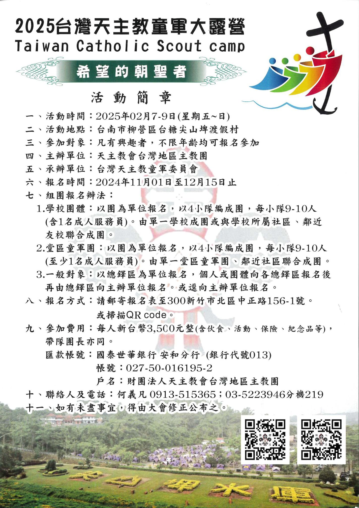 【2025台灣天主教童軍大露營】 時 間:2025年02月07日(五)至02月09日(日) 地 點:台南台糖尖山埤渡假村 主 辦:台灣主教團 台灣天主教童軍委員會 聯絡人:何義凡(03)522-3946#219,0913-515-365 報名方式:向訓育組長鄭詠霖報名 歡迎大家踴躍參加!