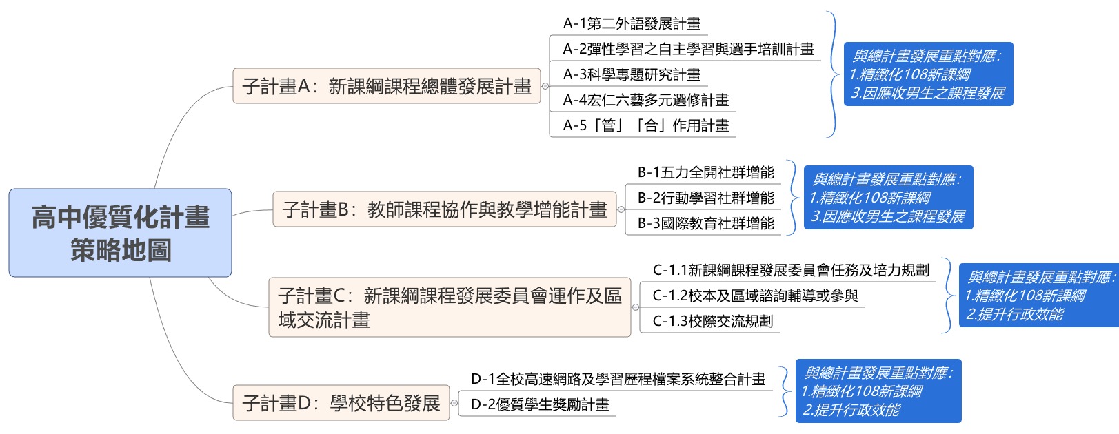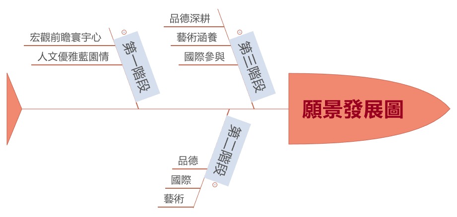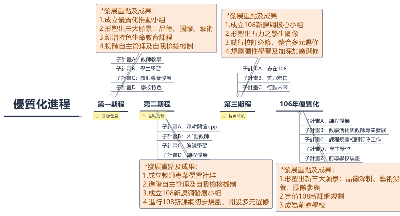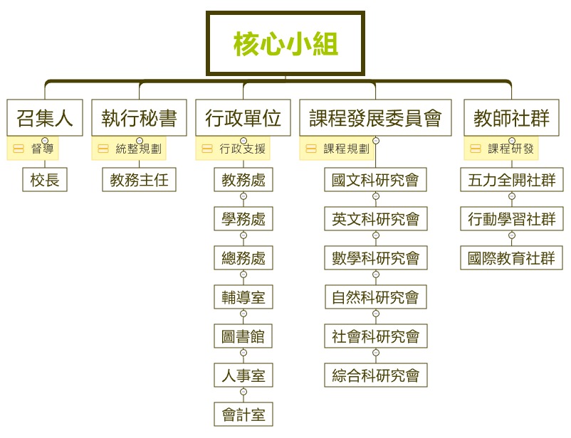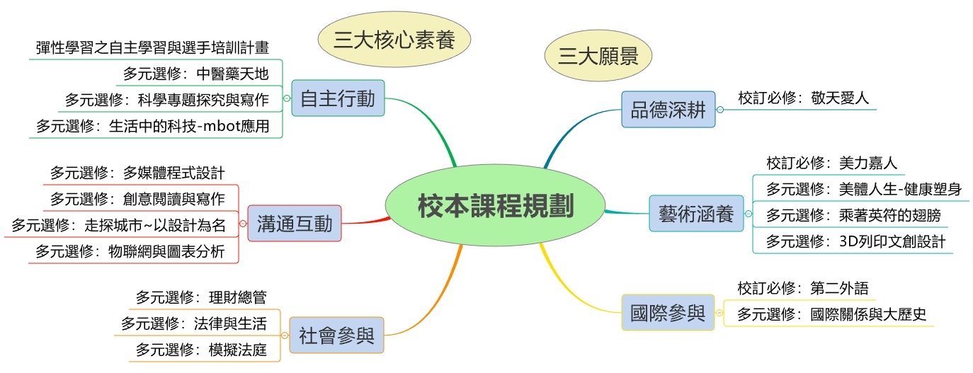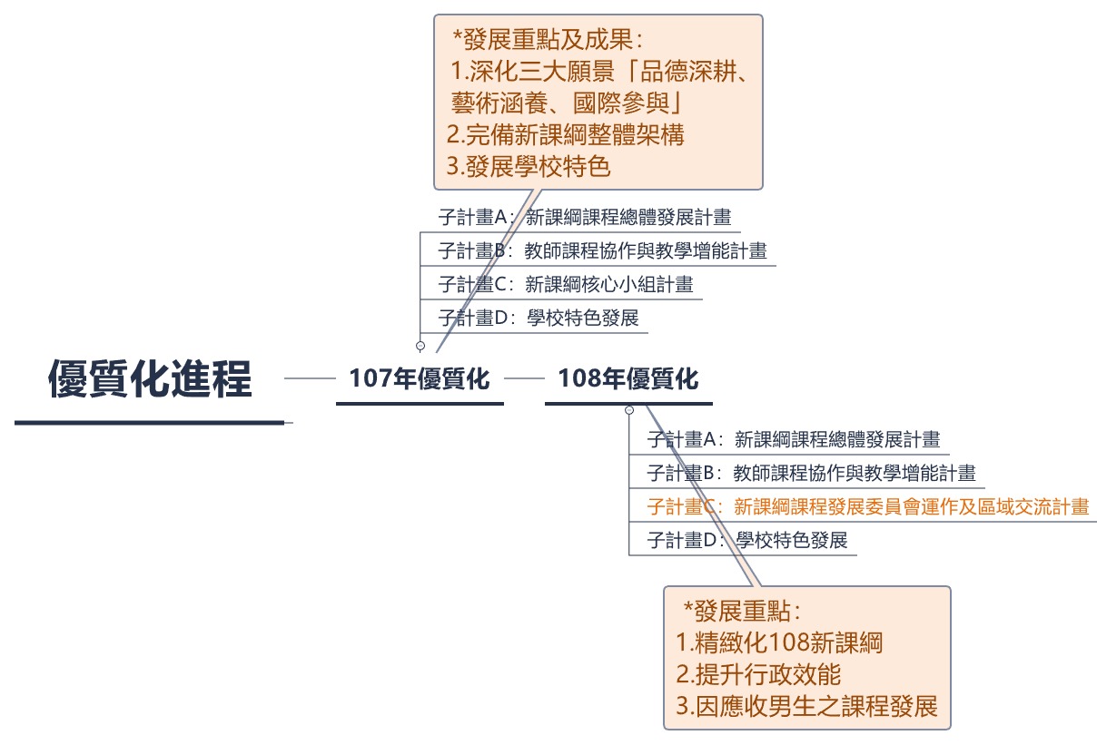 本校在歷經優質化過程中,逐漸在行政效能、教師教學、學生學習上獲得實質上的成果,成立優質化推動小組,形塑出學校願景、學生圖像、完成初階及進階之自主管理及自我檢核機制,之後成立108新課綱發展小組,形塑出新三大願景,開始試行校訂必修、整合多元選修、規劃彈性學習及加深加廣選修等,完備108新課綱整體規劃,並成為前導學校,參考如下圖: