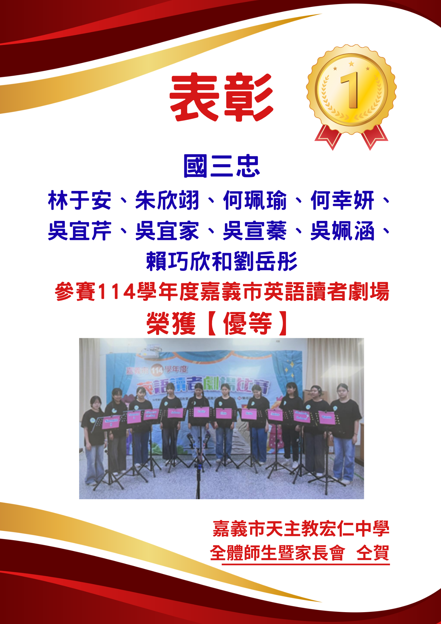 賀! 本校國三忠同學參賽114學年度嘉義市英語讀者劇場 榮獲【優等】